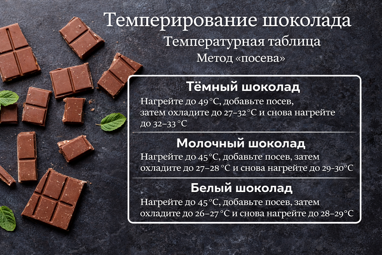 Темперирование — это процесс контролируемого нагревания и охлаждения шоколада, который позволяет стабилизировать какао-масло. Правильно темперированный шоколад имеет глянцевую поверхность, чёткий хруст при разломе и не тает в руках. Без темперирования шоколад становится матовым, мягким и покрывается белым налётом.