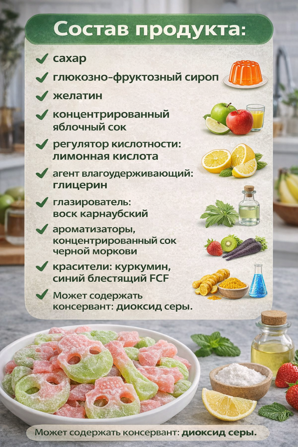 сахар, глюкозно-фруктозный сироп, желатин, концентрированный яблочный сок, регулятор кислотности: лимонная кислота; агент влагоудерживающий: глицерин; глазирователь: воск карнаубский; ароматизаторы, концентрированный сок черной моркови; красители: курку-мин, синий блестящий FCF. Может содержать консервант: диоксид серы.
