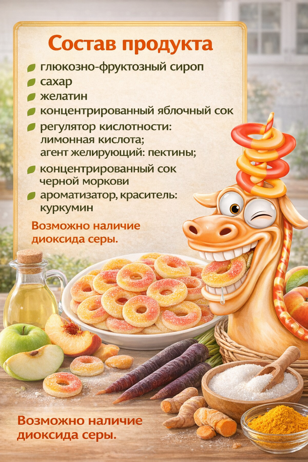 глюкозно-фруктозный сироп, сахар, желатин, концентрированный яблочный сок, регулятор кислотности: лимонная кислота; агент желирующий: пектины; концентрированный сок черной моркови, ароматизатор, краситель: куркумин. Возможно наличие диоксида серы.
