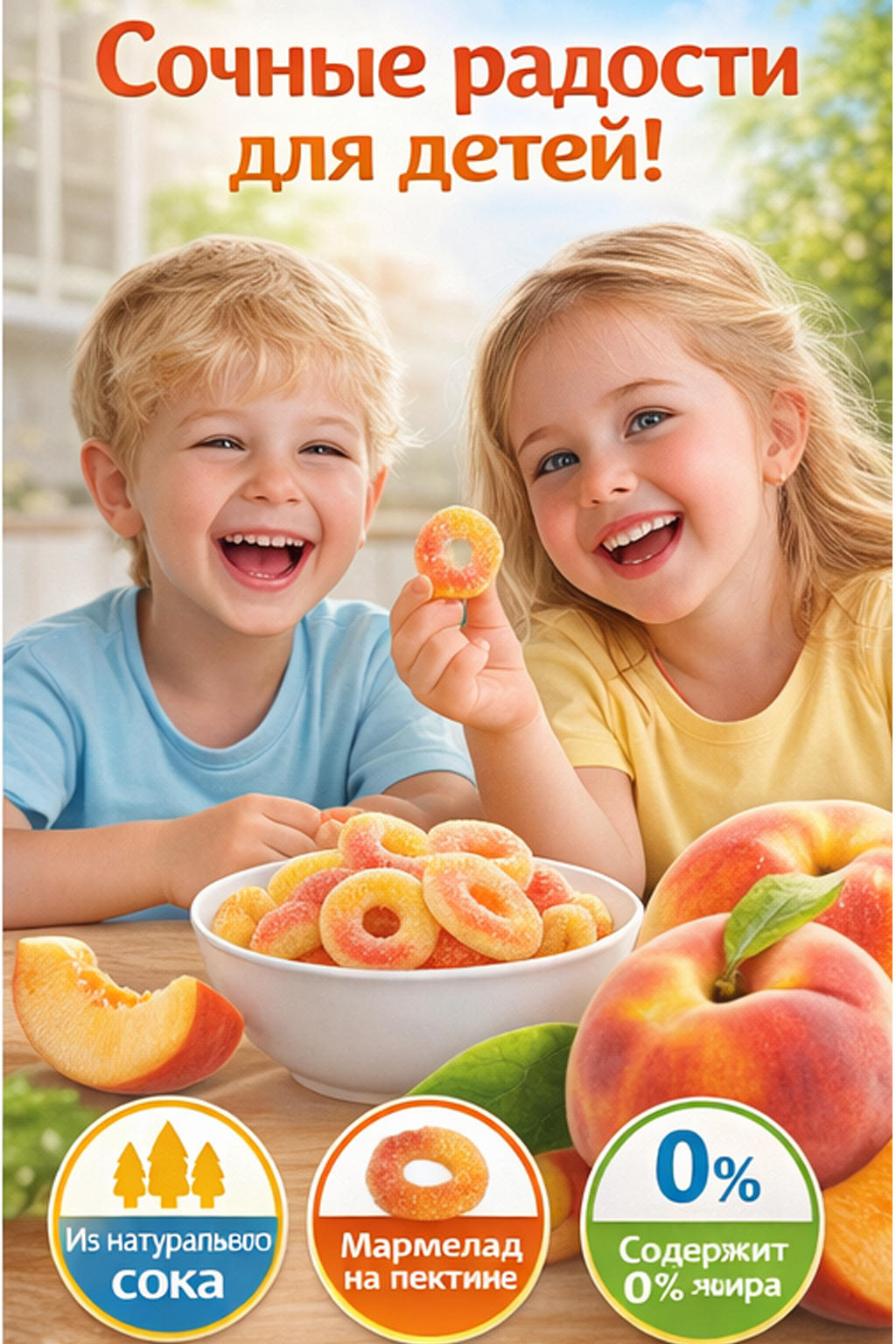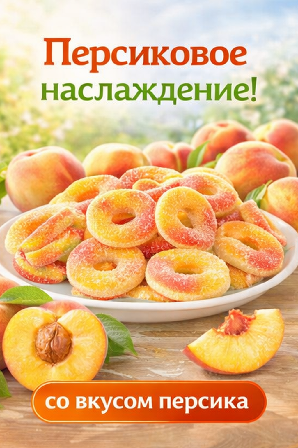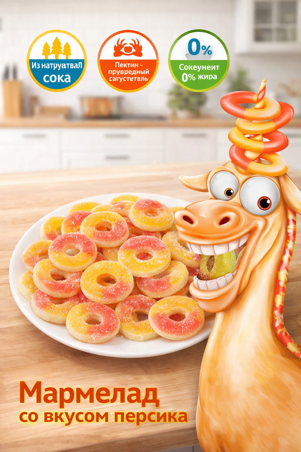 Жевательный мармелад KrutFrut «Колечки со вкусом персика» — это ароматное фруктовое лакомство с мягкой упругой текстурой и насыщенным вкусом. Он станет отличным выбором для быстрого перекуса, а также дополнением к чаю или кофе. В основе продукта — глюкозно-фруктозный сироп, сахар, желатин и концентрированный яблочный сок. Для формирования приятной структуры используются пектины, а сбалансированный вкус достигается благодаря добавлению лимонной кислоты. Натуральные компоненты, такие как сок чёрной моркови и куркумин, придают мармеладу аппетитный цвет и делают его внешний вид привлекательным.