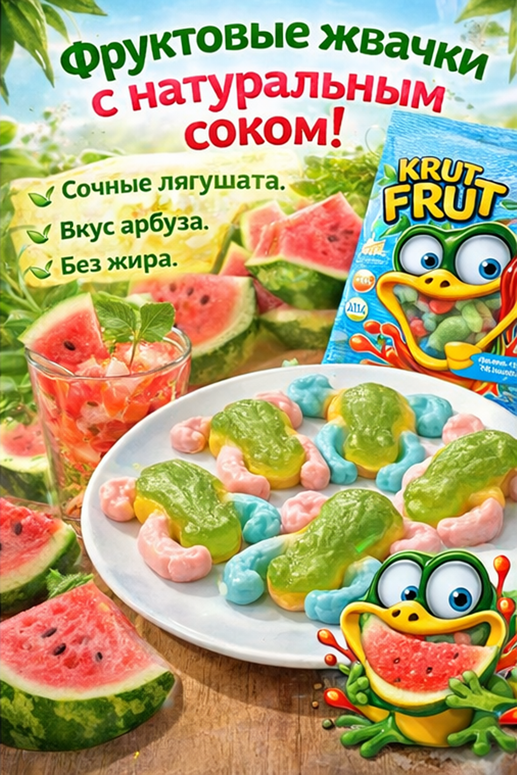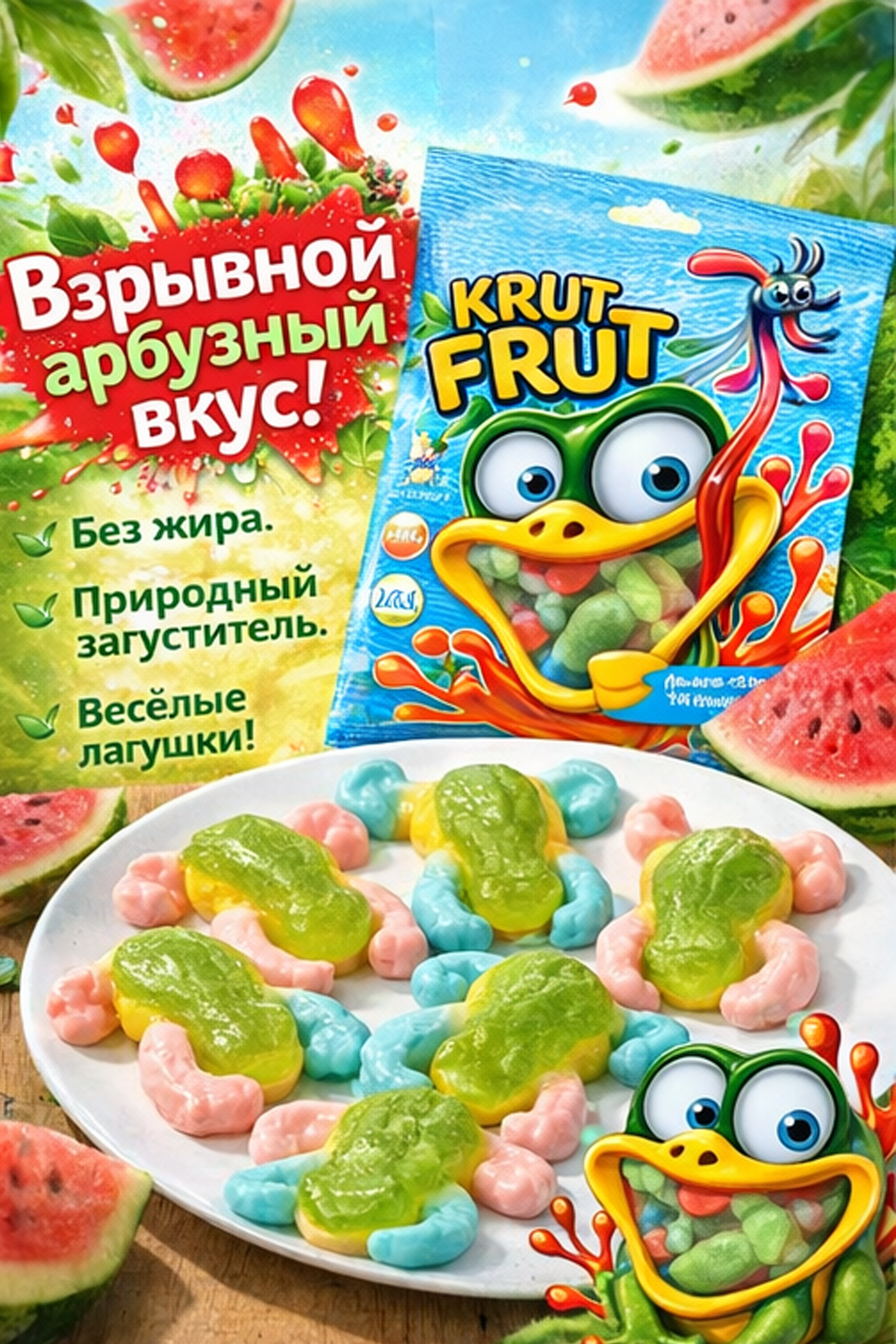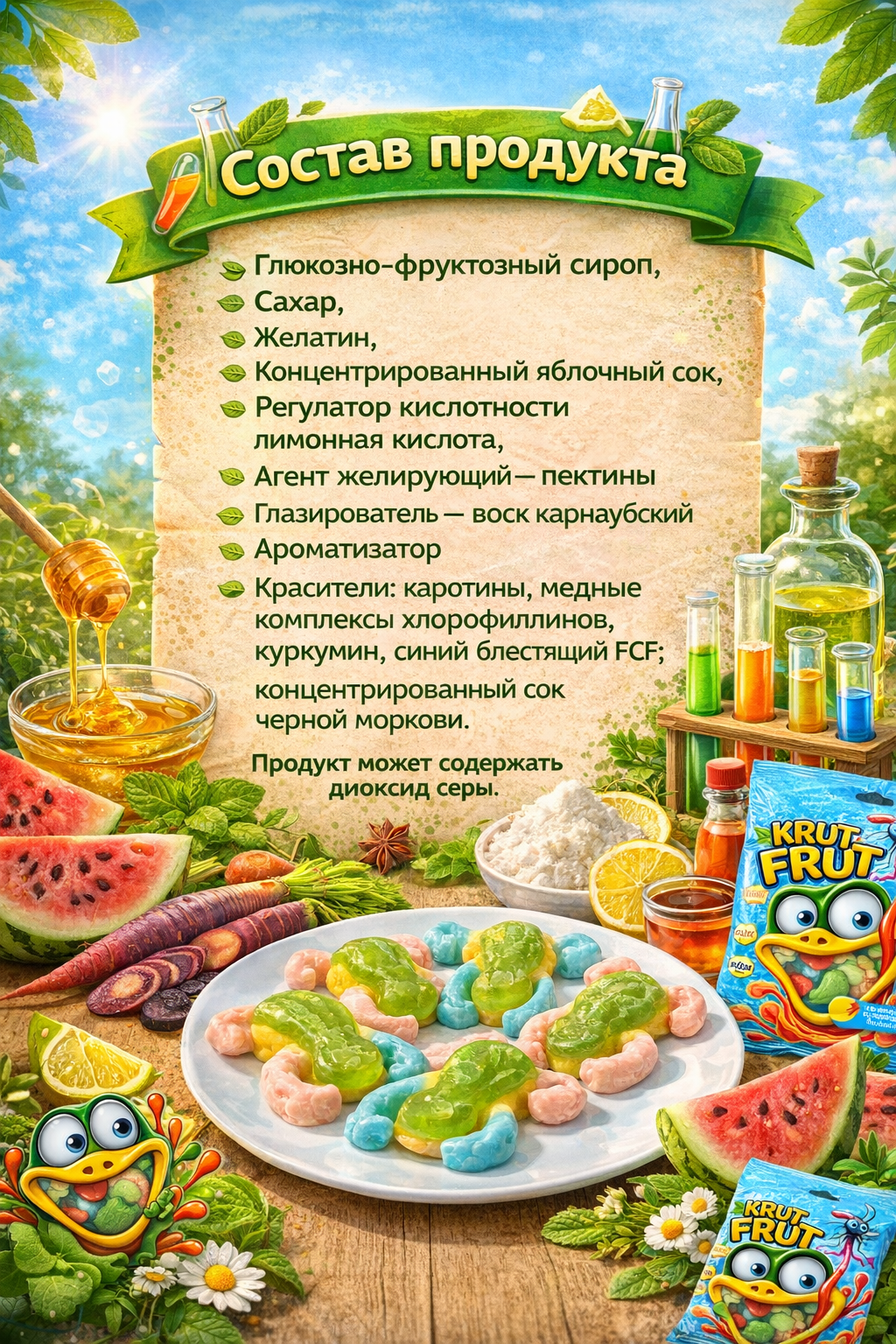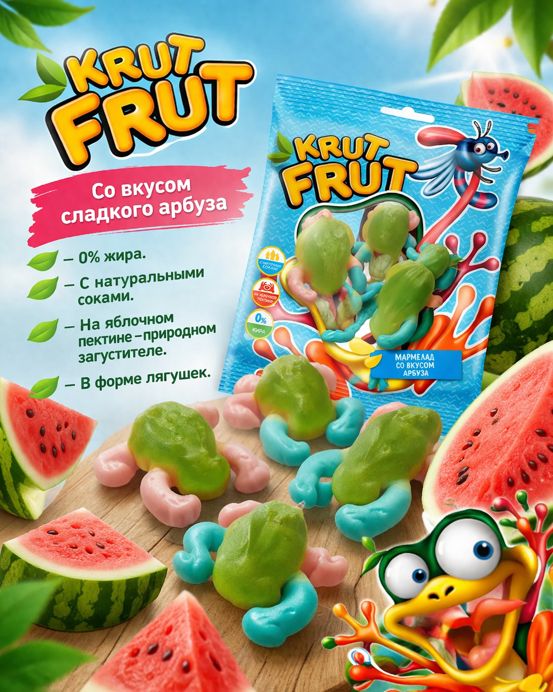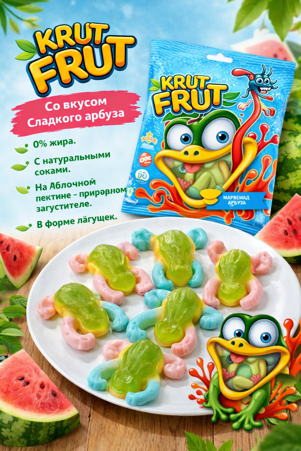 Жевательный мармелад «Лягушки» от KrutFrut — это яркое и необычное лакомство с фруктовым вкусом и оригинальной формой, которое понравится как детям, так и взрослым. Благодаря привлекательному внешнему виду продукт отлично подойдёт для угощения на праздниках, вечеринках или в качестве сладкого перекуса. Мармелад обладает мягкой, упругой текстурой, которая достигается за счёт сочетания желатина и пектинов. В составе используются глюкозно-фруктозный сироп, сахар и концентрированный яблочный сок. Лимонная кислота придаёт вкусу лёгкую кислинку, а натуральные красители, включая каротины, хлорофиллины, куркумин и сок чёрной моркови, обеспечивают насыщенный и аппетитный цвет.