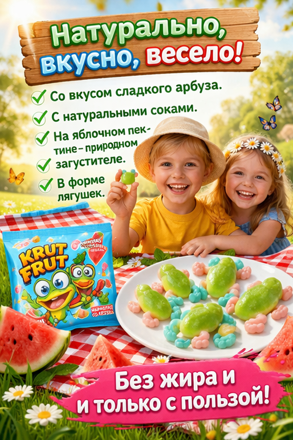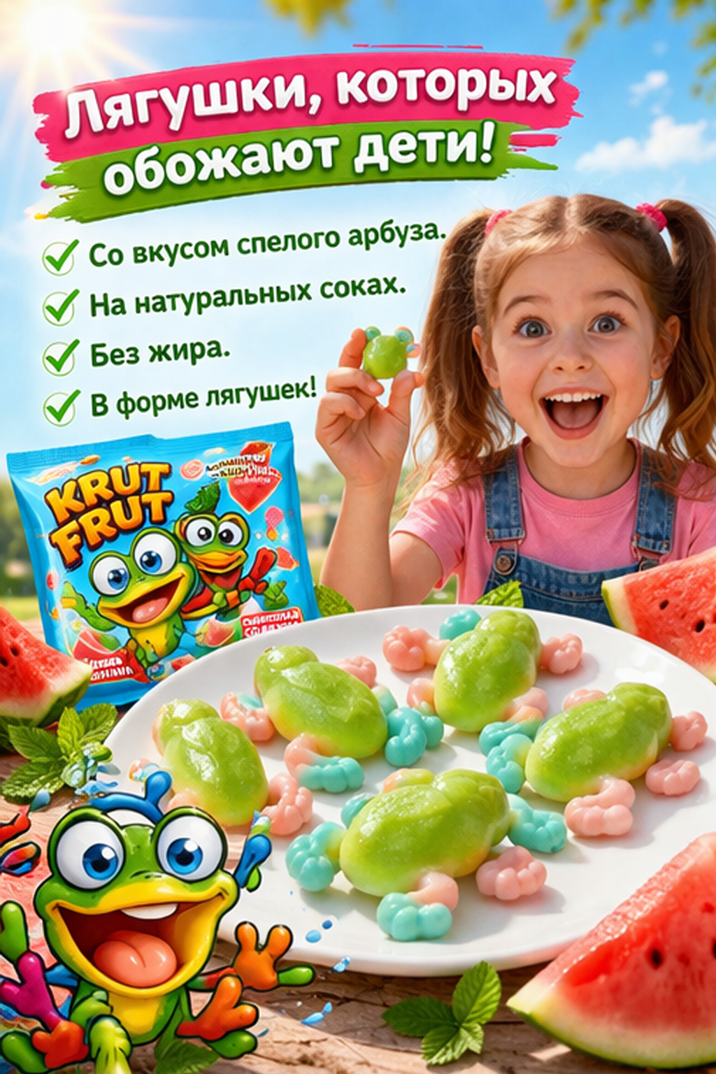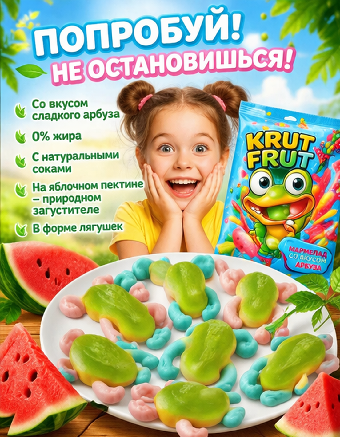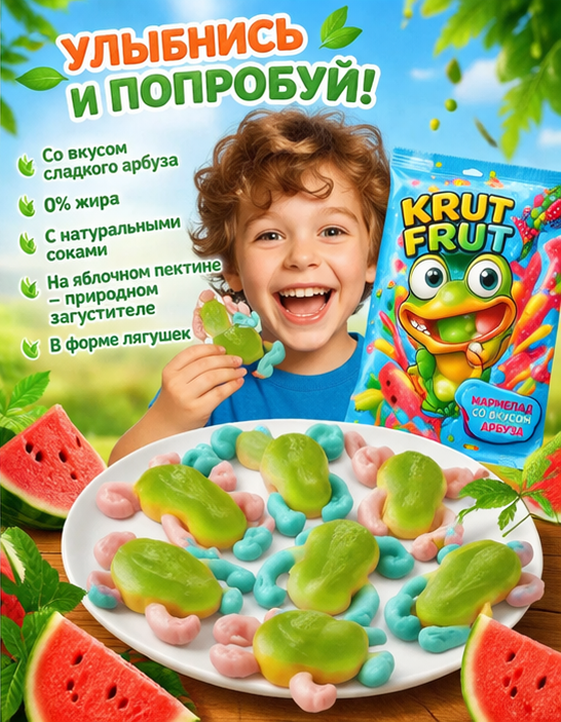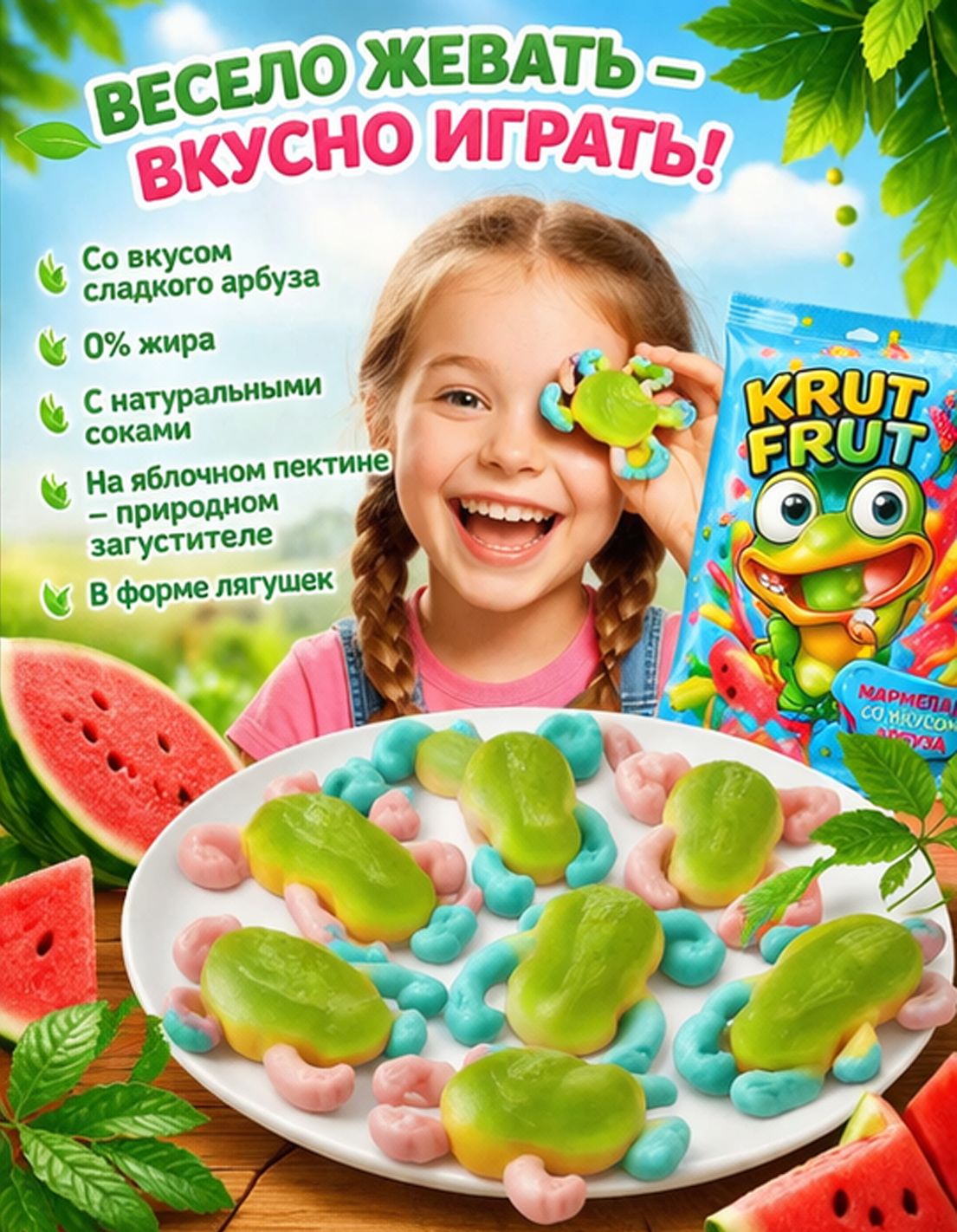 Жевательный мармелад «Лягушки» от KrutFrut — это яркое и необычное лакомство с фруктовым вкусом и оригинальной формой, которое понравится как детям, так и взрослым. Благодаря привлекательному внешнему виду продукт отлично подойдёт для угощения на праздниках, вечеринках или в качестве сладкого перекуса. Мармелад обладает мягкой, упругой текстурой, которая достигается за счёт сочетания желатина и пектинов. В составе используются глюкозно-фруктозный сироп, сахар и концентрированный яблочный сок. Лимонная кислота придаёт вкусу лёгкую кислинку, а натуральные красители, включая каротины, хлорофиллины, куркумин и сок чёрной моркови, обеспечивают насыщенный и аппетитный цвет.