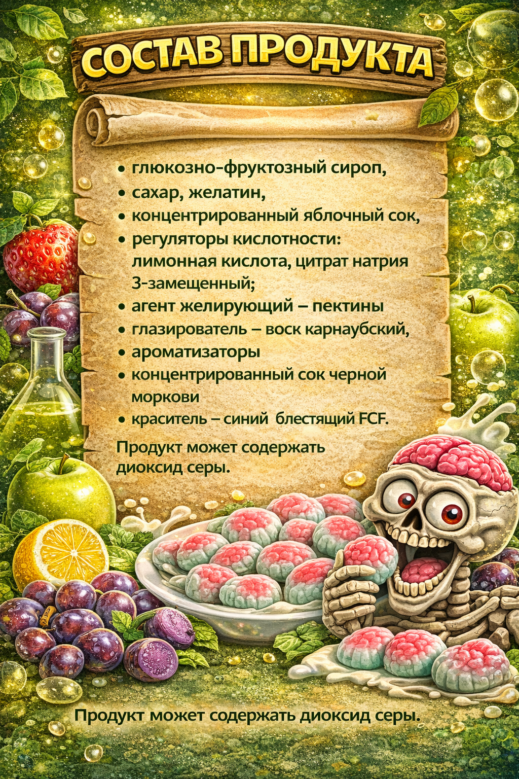 глюкозно-фруктозный сироп, сахар, желатин, концентрированный яблочный сок, регуляторы кислотности: лимонная кислота, цитрат натрия 3-замещенный; агент желирующий – пектины, глазирователь – воск карнаубский, ароматизаторы, концентрированный сок черной моркови, краситель – синий блестящий FCF. Продукт может содержать диоксид серы.