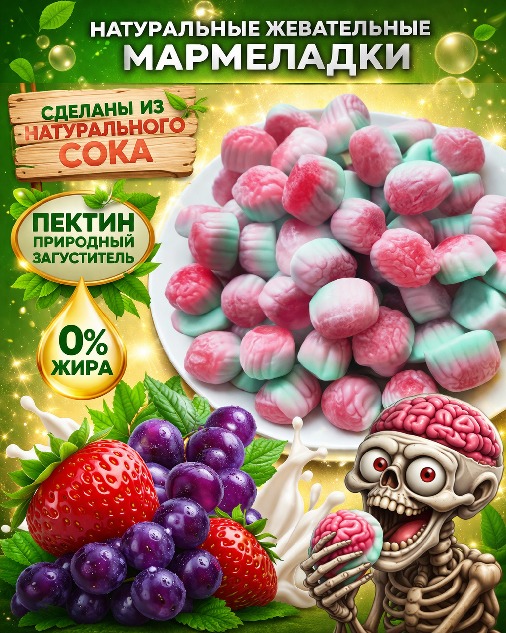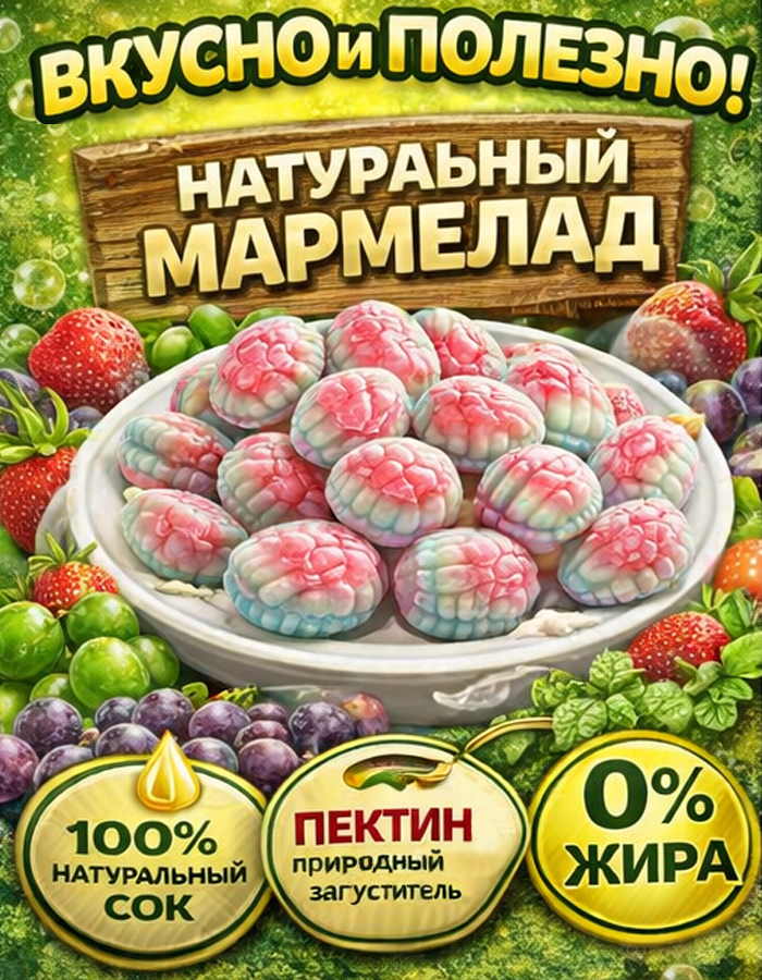 Жевательный мармелад «Мозг» — это оригинальное лакомство с необычной формой и насыщенным фруктово-ягодным вкусом. Продукт привлекает внимание своим дизайном и станет отличным выбором для тематических мероприятий, праздников или в качестве интересного угощения. Мармелад обладает мягкой и упругой текстурой, которая достигается благодаря сочетанию желатина и пектинов. В составе используются глюкозно-фруктозный сироп, сахар и концентрированный яблочный сок, а регуляторы кислотности придают вкусу приятную сбалансированную кислинку. Натуральные компоненты, такие как сок чёрной моркови, а также пищевые красители обеспечивают яркий внешний вид продукта. Энергетическая ценность составляет 310 ккал на 100 г. В составе содержится 5,5 г белков и 73 г углеводов, что делает мармелад источником быстрой энергии. Продукт производится в России компанией ЗАО «КДВ Павловский Посад» в соответствии со стандартом ТУ 10.82.23-007-50164020-2011. Удобная фасованная упаковка подходит для хранения и использования дома или в дороге. Рекомендуется хранить при температуре (18±3) °C и относительной влажности воздуха не более 70%.