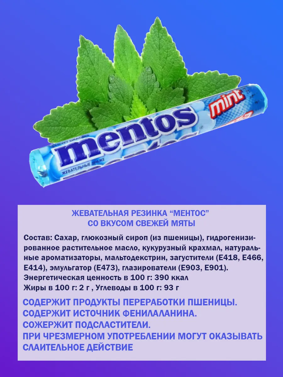 Жевательная резинка Mentos — это ароматные круглые драже с яркими цветными вкраплениями и насыщенным фруктовым и мятном вкусом. Жвачка надолго сохраняет вкус и не теряет мягкости при жевании. Подходит для детей и взрослых, используется в торговых автоматах, магазинах и для личного употребления. Жвачка отлично подходит для использования на детских праздниках, Candy-Bar столах, в наборах сладостей, подарочных коробках или как отдельное лакомство. Формат фасовки делает продукт удобным для бизнеса, оптовых закупок и сегмента HoReCa. Преимущества: Длительное сохранение вкуса Хрустящая оболочка и мягкая жевательная текстура Удобный формат для дозирования Привлекательный внешний вид Универсальное использование: автоматы, магазины, подарочные наборы, личное употребление